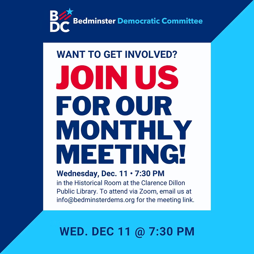 We invite you to join us by attending our monthly meetings on the 2nd Wednesday of the month in the Historical Room at the Clarence Dillon Public Library. Our next meeting is on Wednesday, Dec. 11th at 7:30 PM. For those unable to attend in person, or if the weather prohibits, you may join us via Zoom and simply email us at info@bedminsterdems.org for the meeting link.